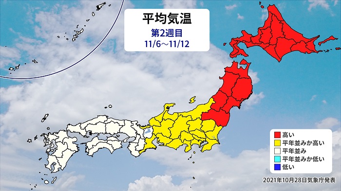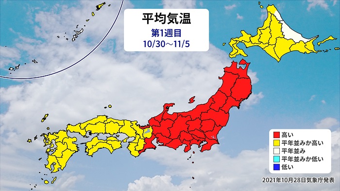 最後にこの先はどんな天気になるか1か月予報を見ていきましょう。10月28日現在の情報を見ると、この先は寒気の影響を受けにくく各地で暖かい空気に覆われやすい予報となっています。期間の前半は北日本で気温がかなり高くなる傾向です。