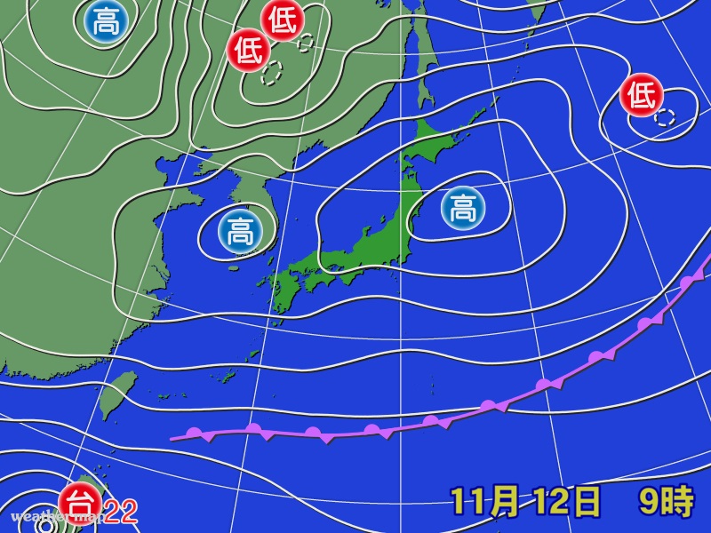 霜はどんな時に起きるのでしょうか?天気図を見ると、移動性の大きな高気圧がやってくるときに霜が発生しやすいです。