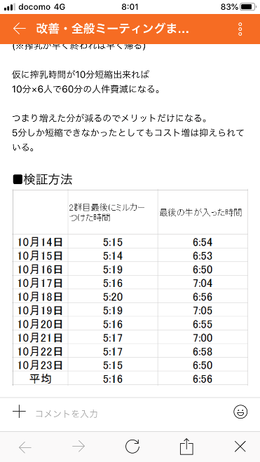 ある酪農家では「LINEWORKS」というソフトを使って従業員がスマートフォンやパソコンを通して提案をしています。特に新しく入った従業員は新鮮な目で様々なことに気付いた場合でも、経営者や先輩従業員に直接言いにくいことがあるかもしれません。そこで、コミュニケーション・ツールを利用して、気づいたことを発信してもらう場を作るのです。
