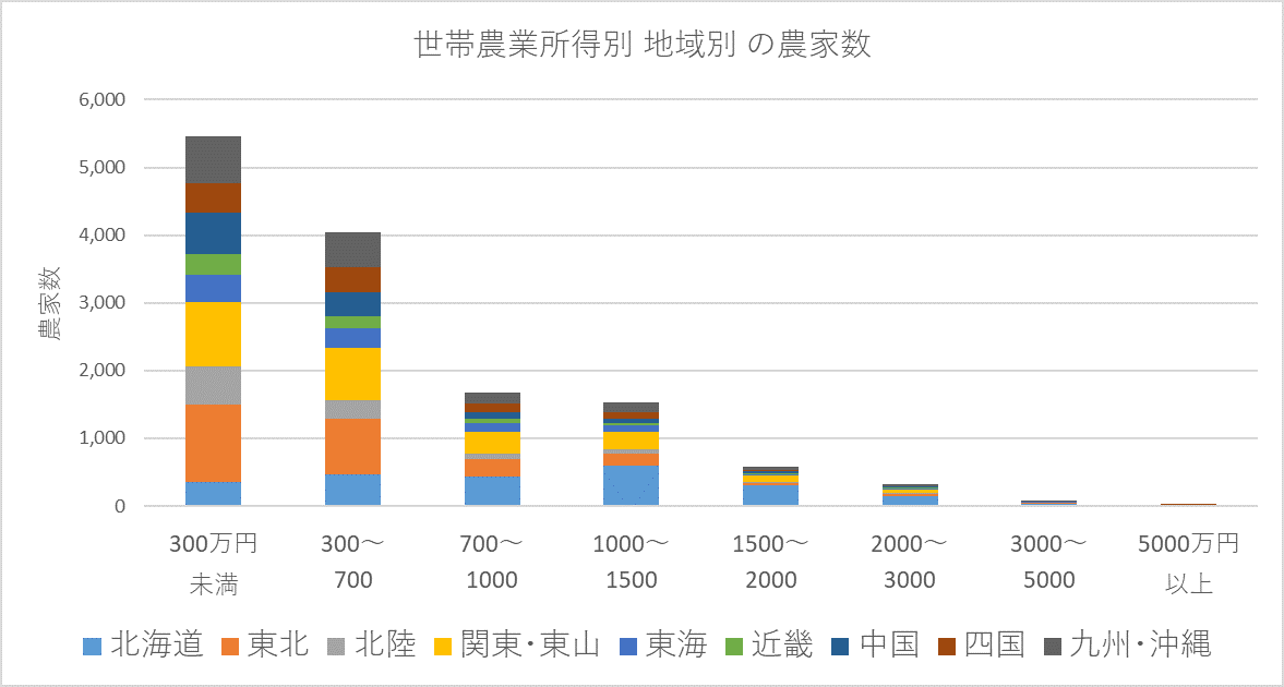 世帯農業所得別の地域別農家数は以下のようになりました。