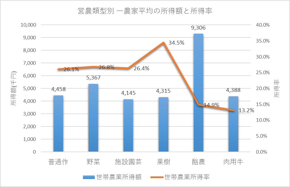 普通作(稲作+大豆・麦)、野菜、施設園芸、果樹、酪農、肉用牛、の6つの営農類型別に一農家平均の世帯農業所得額と世帯農業所得率を分析してみました。