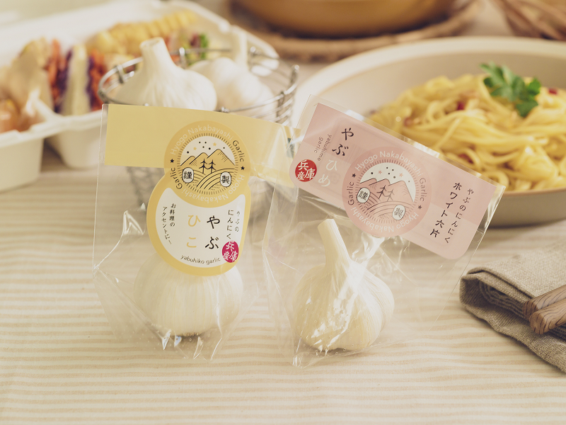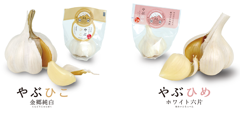 平地の圃場では、主に九州や四国で栽培されている暖地系にんにく金郷純白「やぶひこ」を栽培。一方、標高約500mの高地の圃場では、青森県を中心に栽培されている寒地系にんにくホワイト六片「やぶひめ」を育てています。