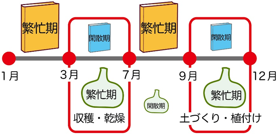 しかし、農業も(年間を通して決して目が離せないものではありますが)、一毛作の場合、作物によっては、植え付け・収穫時期とそれ以外の時期で繁閑の差が大きいことが、課題の1つなのではないでしょうか。
