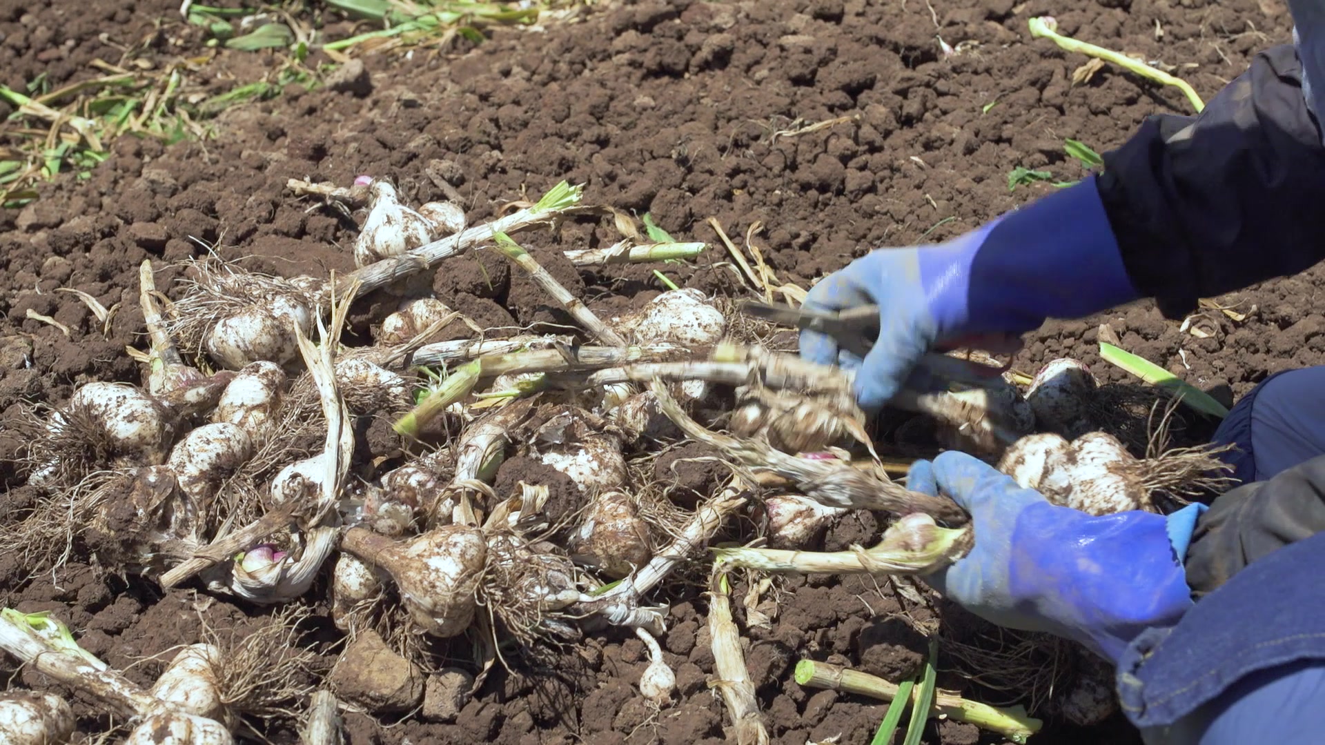暖地系にんにくが早い収穫を迎え、その後、寒地系にんにくの穫り入れ期となります。それぞれ収穫時期が重ならず、差異があることが、農作業の平準化にも寄与しています。