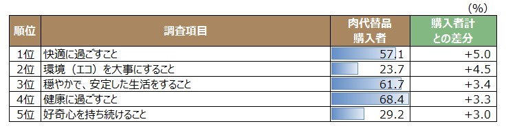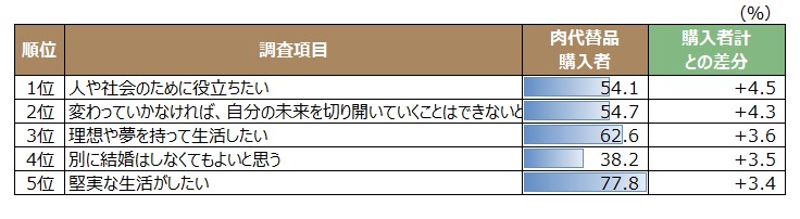 ”人や社会のために役立ちたい”や”環境(エコ)を大事にすること”などの項目で、肉代替品の購入者の方が多く「当てはまる」と回答していることから、社会や環境問題により高く意識を持っていることが窺えます。