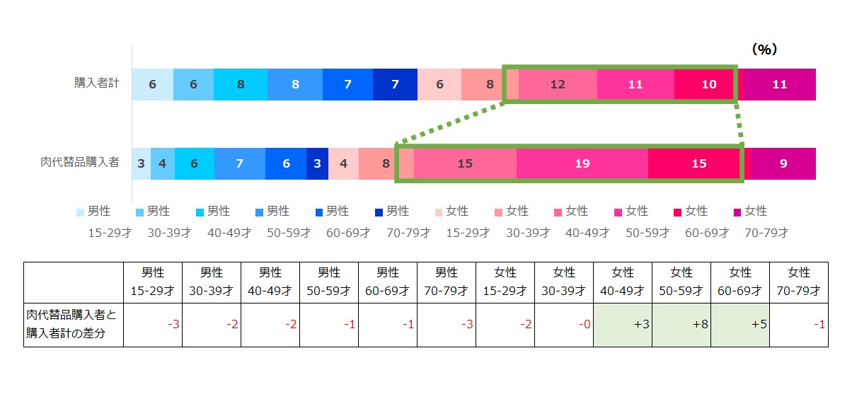 その一方、男性では、すべての年代で肉代替品購入者の構成比が購入者系のものを下回っていることから、性別や年代によって肉代替品の購入傾向に違いがあることが見て取れます。