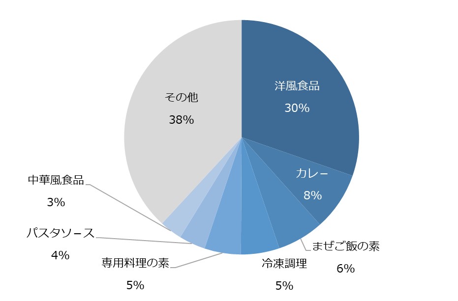 最も構成比の大きい洋風食品は、「ハンバーグ」「ナゲット」などです。まぜご飯の素は「ガパオライス」、専用料理の素は「麻婆豆腐」、その他は「ひき肉」などで、さまざまな肉代替品の商品が販売されていることが分かります。