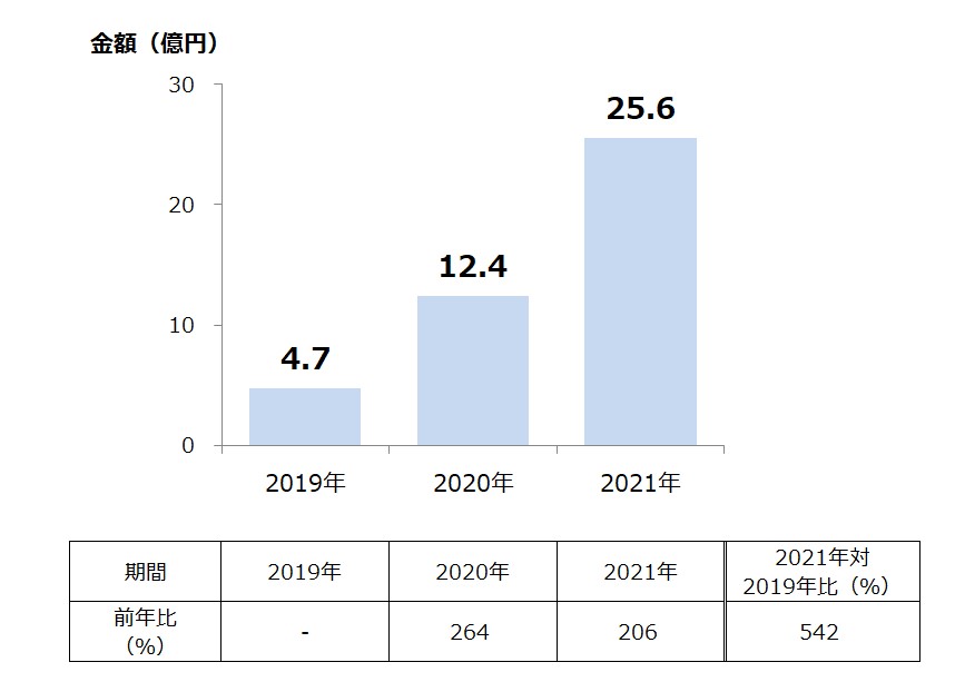 2019年から2021年にかけて、毎年2倍以上の成長を続けており、2021年には2019年との比較では5倍以上の25億6,000万円にまで拡大しています。
