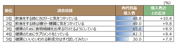 インテージSCI Profilerとは、生活や健康などに関する考え方や行動などについて、SCIモニターより年1回聴取しているものです。2021年の肉代替品の購入者では、どういった項目で「当てはまる」と回答した人が多かったのでしょうか。洋風食品の購入者計と比較して、回答率で特に差分が大きかった上位5項目を見てみましょう。