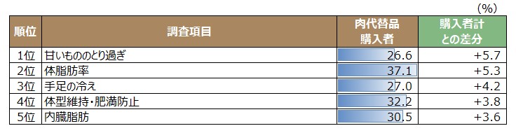 肉代替品に含まれる植物性のタンパク質は、動物性のものと比べて脂質が少なく、食物繊維が豊富とされています。このことから、健康面で肥満などの悩みを抱えている人が、健康・ダイエットのために肉代替品を購入していると考えられます。