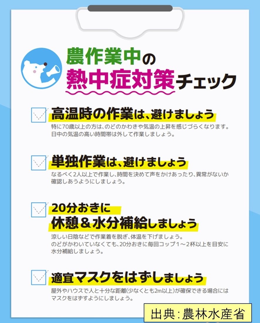 熱中症警戒アラートは前日の午後5時か、当日午前5時に暑さ指数33が予想される時に発表されます。この場合猛烈な蒸し暑さが予想されています。危険な状況ですから、原則作業は止めましょう。命の危険の及ぶ暑さと認識する必要があります。その他、農作業中の熱中症対策を4つお伝えします。①高温時の作業は避けましょう。②単独作業は避けましょう。(なるべく2人以上で作業を)③20分おきに休憩・水分補給④適宜マスクを外しましょう。今月も天気に振り回される日々が待っていそうです。上手に最新の気象情報を利用し、大雨や季節外れの暑さから農作物と自分の身を守っていきましょう。