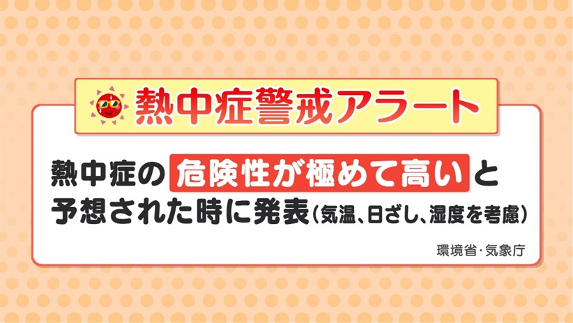 果樹や野菜の管理はもちろん大切ですが、一番気をつけなければいけないのは、作業する皆さんの健康です。5月は体が暑さに慣れていない時期です。そこに季節外れの暑さが予想されているのですから、なおさら注意が必要です。続いて紹介する最新の気象情報は、「熱中症警戒アラート」です。一体この情報はどんなものなのでしょうか?これは、去年の夏から全国的に発表が開始された比較的新しい情報です。暑い日の中でも特に暑くなると予想され、「熱中症にかかる危険性がかなり高まるおそれがある時に発表」されます。「いつも以上に、積極的に熱中症予防に努めて欲しい時に発表」される物だと覚えて頂ければと思います。