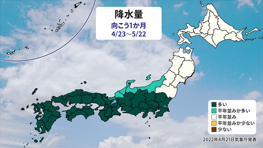 気象庁発表の1か月予報を見てみましょう。まず平均気温は全国的に並みか高い傾向です。また同じく東・西日本を中心に雨量が多く、日照時間も少ない予想となっています。平年の5月ならば、高気圧と低気圧が交互にやってきて、強い雨風の日もあれば、晴れる時はカラッとした暑さの日もあるというイメージです。しかしながら、今年はどうやら違うかもしれません。農家の皆さんにはあまり嬉しくない天気となる可能性が高まっています。