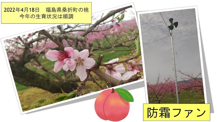 少し話は遡りますが、去年の春、東北地方を中心に記録的な遅霜被害が発生しました。私は、先日桑折町の桃農家に取材しました。こちらは皇室へ献上する桃産地として有名です。去年の遅霜被害時にも取材しましたが、今年はある変化に気づきました。それは、霜対策用の「防霜ファン」が設置されていたのです。これは上空の暖かい空気を送る事で、地上が冷え込まないようにする装置です。この装置の助けもあり、今年の桃は順調に育っていました。