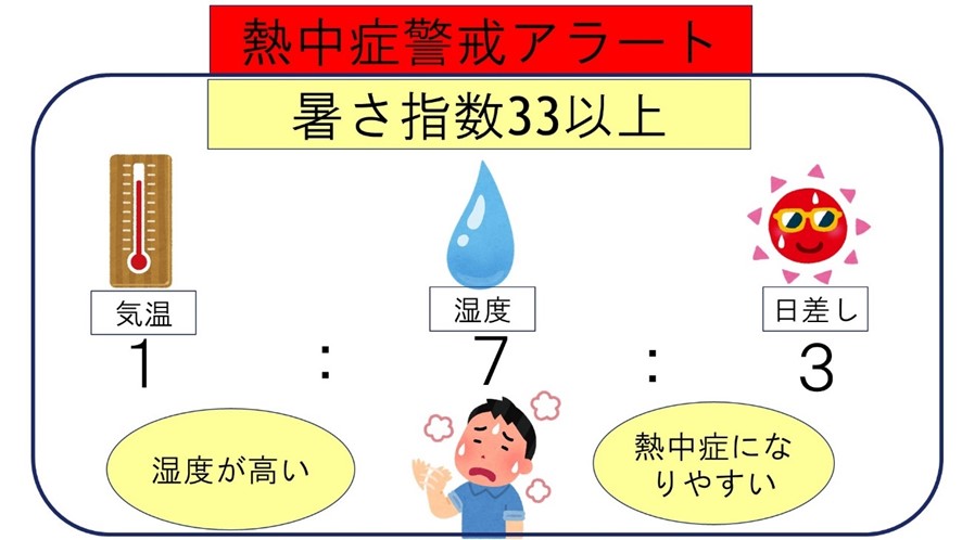普段皆さんは、暑くなるかどうかを予想気温で確認されると思います。しかしながら、ここには問題がありました。気温のみの判断だと、熱中症で救急搬送される人数とどうも関係性が一致しないのです。そこで、暑さの判断を気温だけでなく、「湿度」、「日差しの強さ」などを取り入れる事にしたのです。その新たな情報が「熱中症警戒アラート」です。これは気温だけでは分からない、「猛烈な蒸し暑さ」を予想していると覚えておいてください。