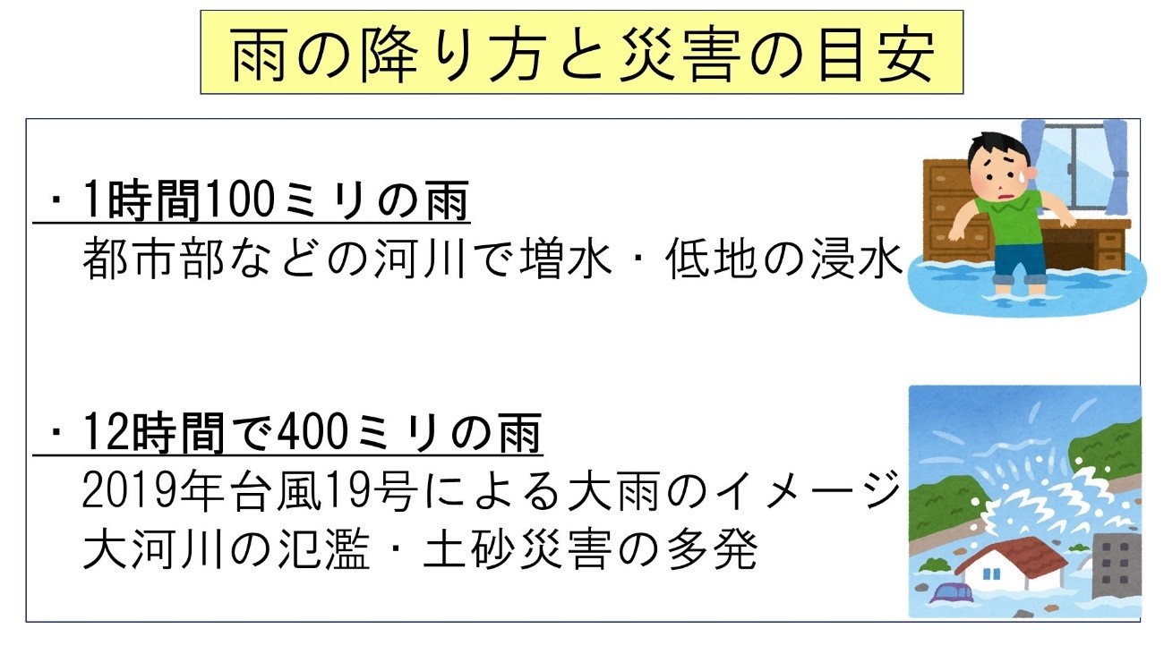 ① 1時間に100ミリの雨は「都市部などの河川で増水、低地の浸水」が発生。
