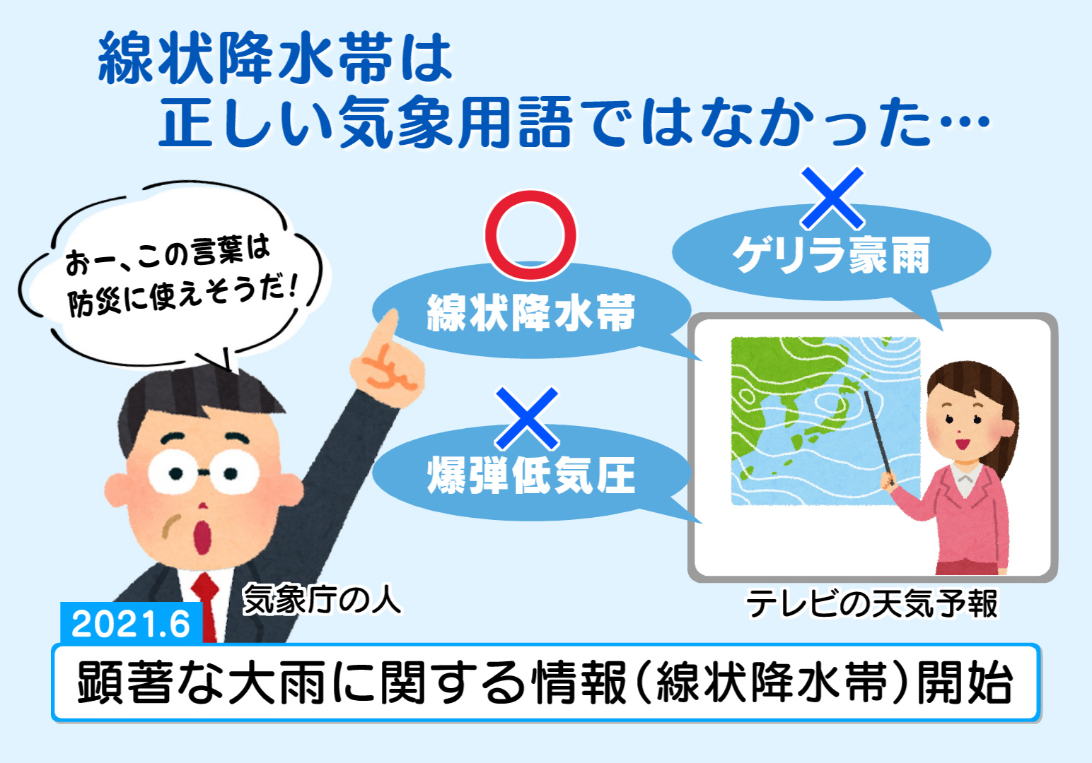 「線状降水帯」は、そもそも正式な気象用語ではありませんでした。実はメディアから生まれた造語です。ゲリラ豪雨や、爆弾低気圧などもその類で、いまだに正式な気象用語ではありません。ただし、それらの言葉と違うのは、気象庁はこの線状降水帯という言葉を正式な気象用語にした事です。広く世間に浸透したこの線状降水帯という言葉をキーワードとして捉え、防災に活用しようと考えたのです。
