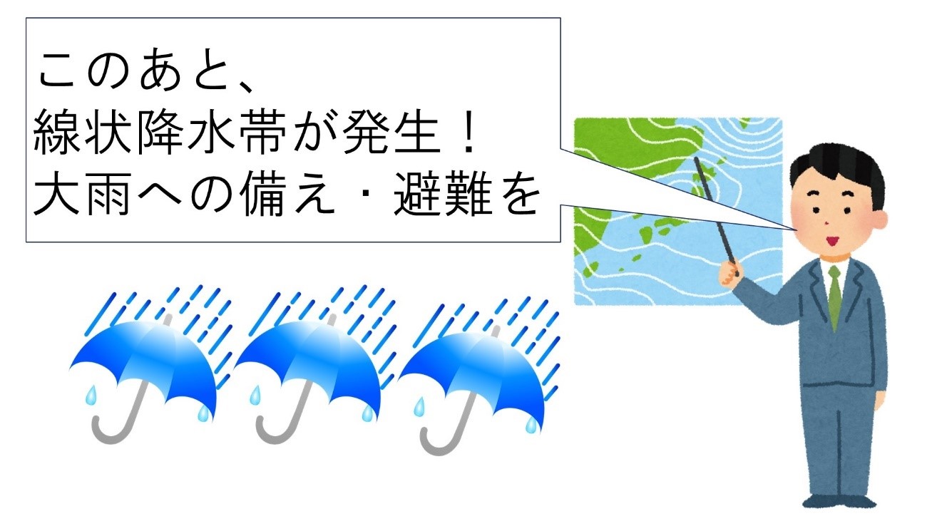 気象庁は、昨年6月に「顕著な大雨に関する情報」の提供を開始しました。これは、一言で言うと、「〇〇県で線状降水帯が発生していますよー。」という現状を伝える情報です。線状降水帯が発生し、命に危険が及ぶような土砂災害や洪水による災害発生の危険度が急激に高まっているという事なんですね。ですから、この情報が発表された時には、以下のような行動が求められます。