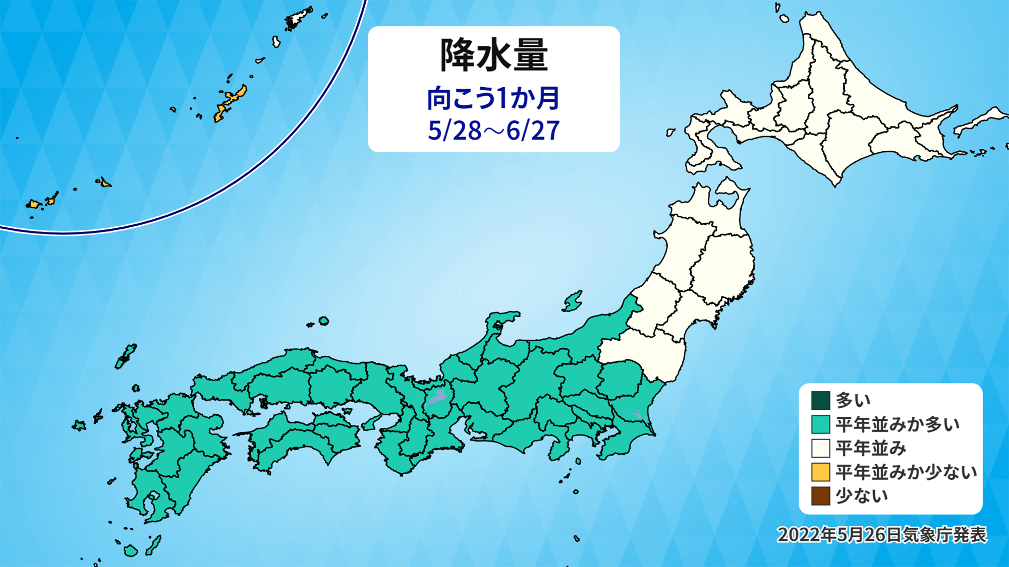 最新の1か月予報で降水量を見てみましょう。すると西・東日本を中心に降水量が平年並みか多い予想となっています。やはり今年も大雨に注意が必要となりそうです。