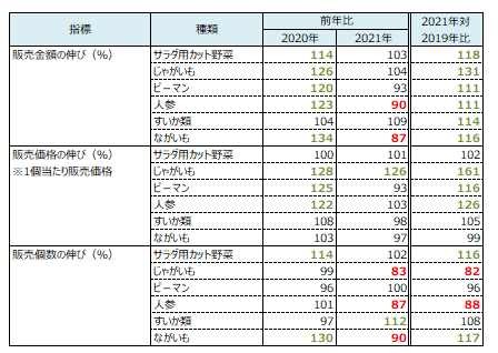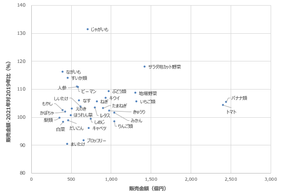 最も販売金額が伸びていた「じゃがいも」は、販売価格が2020年・2021年ともに20%超上昇したことで、2021年対2019年比では161%と大幅に高くなっています。