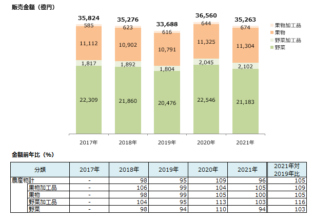 農産物の市場規模は、2019年にかけて減少傾向にありましたが、コロナ1年目の2020年に前年比109%と増加に転じました。