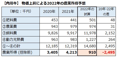 肉用牛も飼料費が1千万円かかっていますので影響は大きくて、農業所得は250万円減少の91万でありこの農業所得額では生活していけません。