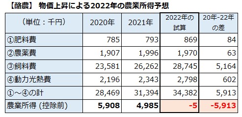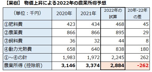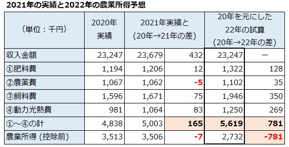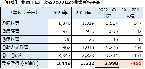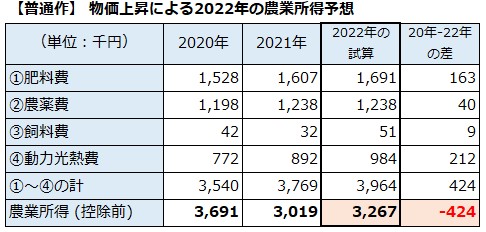 2021年はすでに物価上昇が始まっていましたので、2020年をベースとして2022年3月までの物価上昇アップ率をもとに2022年の経営を試算すると、4費用の合計がなんと78万円もアップし、農業所得が273万円という計算になります。これは22%ダウンですからかなり農業経営を直撃すると予想できます。