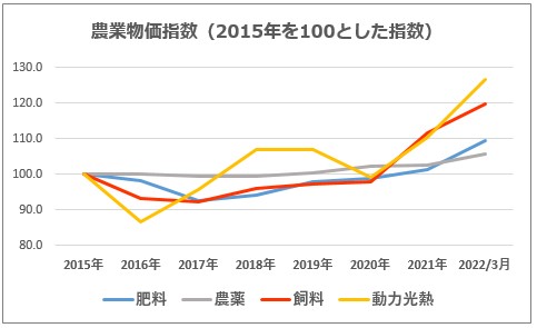 2015年から2020年まで動力光熱以外はほとんど変化が無かったのですが 、2021年から徐々に上昇し、2022年3月の指数は、肥料は109.5、飼料は119.8、動力光熱は126.5と高騰しています。海外から輸入している飼料や石油は、価格高騰+円安のダブルパンチなのでしょう。