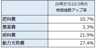 2021年は2020年と比較して経営にどのような変化があったのか、そして、2020年から2022/3月までの物価指数アップ率は以下の通りですので、このアップ率に基づいて2022年の農業経営はどうなっていくと予想できるのか調べてみたいと思います。