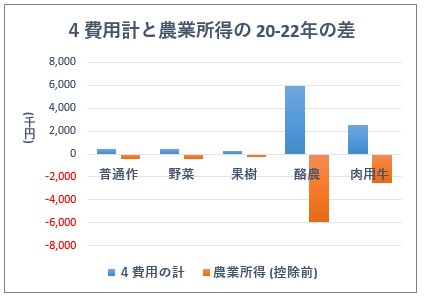 以下の表のように、すでに物価上昇が始まっていた2021年は2020年と比較して、4費用の農家一戸当り全国平均の合計は16.5万円増加していました。しかし、2021年は雑収入(補助金等含む)が増加し、結果として収入金額が増えており、経費が増えても農業所得の変化はありませんでした。