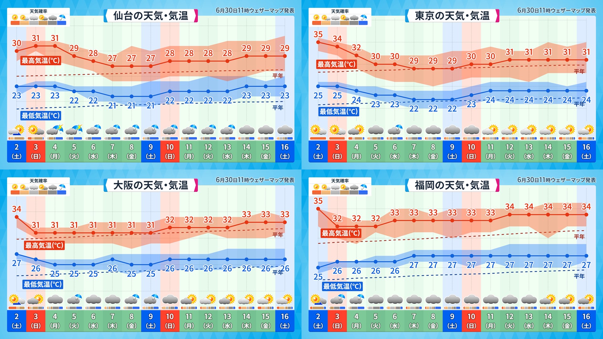 日中の気温は30℃前後の蒸し暑さが続く見込みで、夜は西日本を中心に25℃以上の熱帯夜となるでしょう。