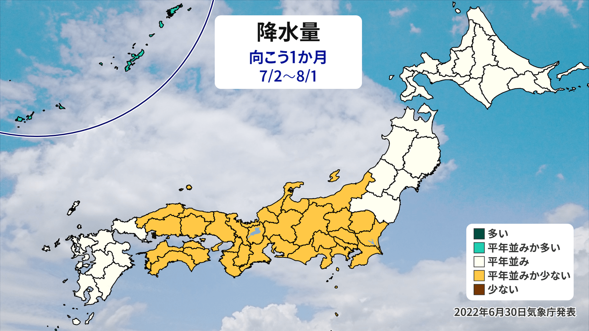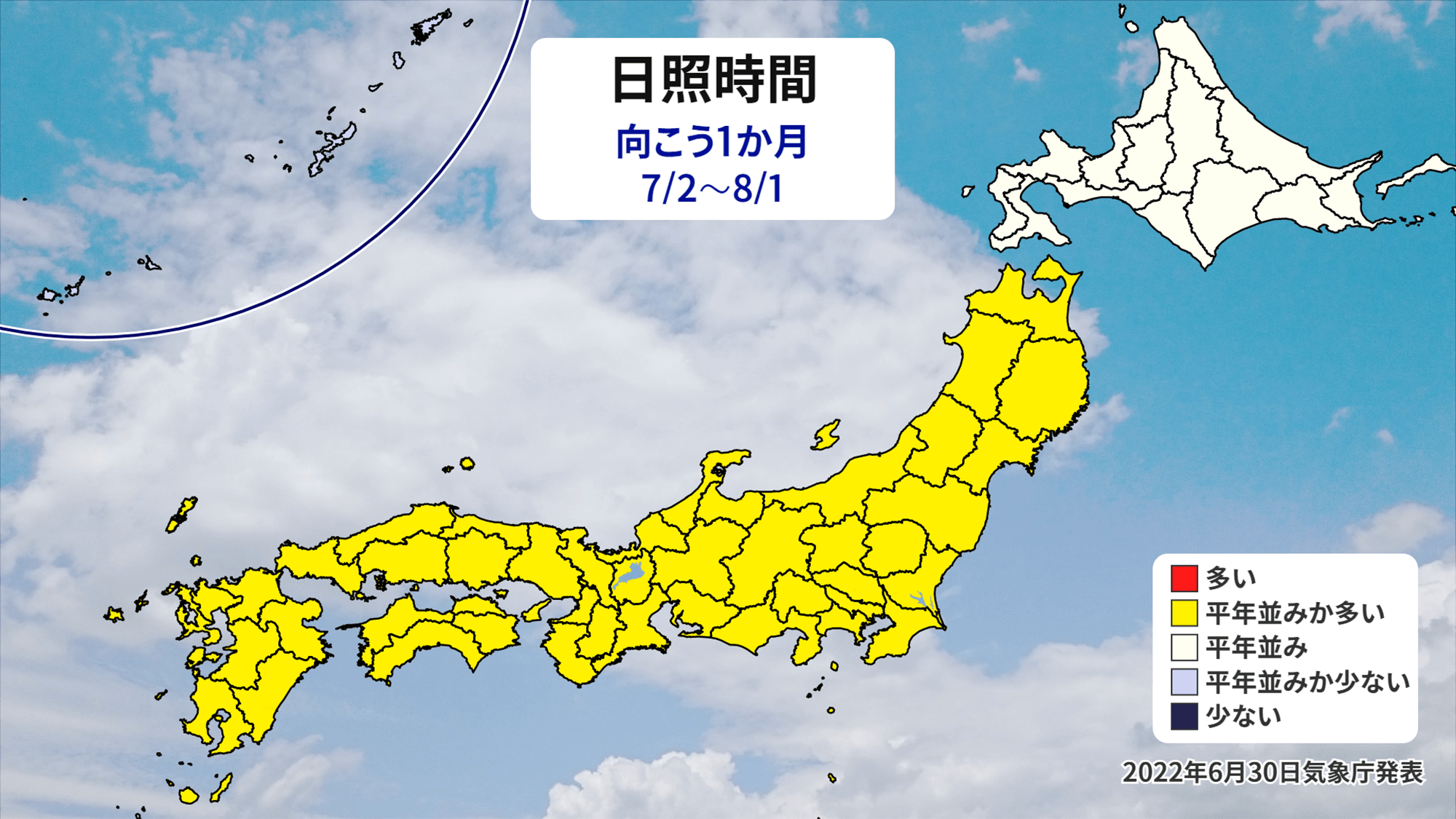 6月30日現在、まだ梅雨が明けていないのは、梅雨のない北海道を除いて東北北部(青森、岩手、秋田)のみです。異例の早さとなった梅雨明け後は、全国的にこの時期とは思えないような猛烈な暑さに見舞われています。7月はこのまま晴れて暑い日が続くのでしょうか?