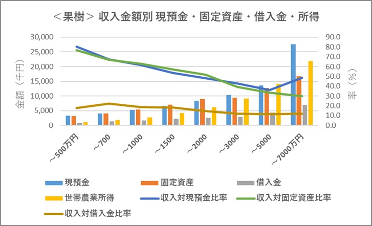 果樹経営の収入金額7,000万円でも、借入金比率は低く、現預金比率がぐっと高くなっています。さらに、普通作や野菜農家の借入金は2,000〜4,000万円であるのに対して、果樹農家は680万円ですから、非常に借入金が少なくて安全性が高い経営を行えていると言えます。