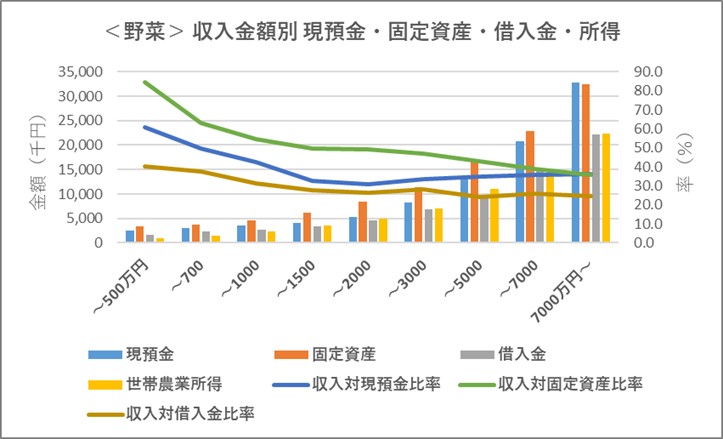 野菜経営では、収入金額7,000万円以上は借入金も世帯農業所得も2,200万円なので返済可能ではないかと思われます。しかし、データを詳細に調べると、収入金額が約1億円の経営は借入金が4,000万円以上あり、収入金額対借入金比率が36%と少し高くなっています。この点から安全性としての最適規模は1億円未満ではないかと思われます。