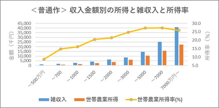 持続可能な農業経営には、何と言っても経営継続できる所得額と、高い農業所得率(効率性)であることが重要です。以下のように収入金額規模別に、雑収入と世帯農業所得額(控除前農業所得+専従者給与)と世帯農業所得率(収入金額に対する所得額の率)をグラフにしてみました。