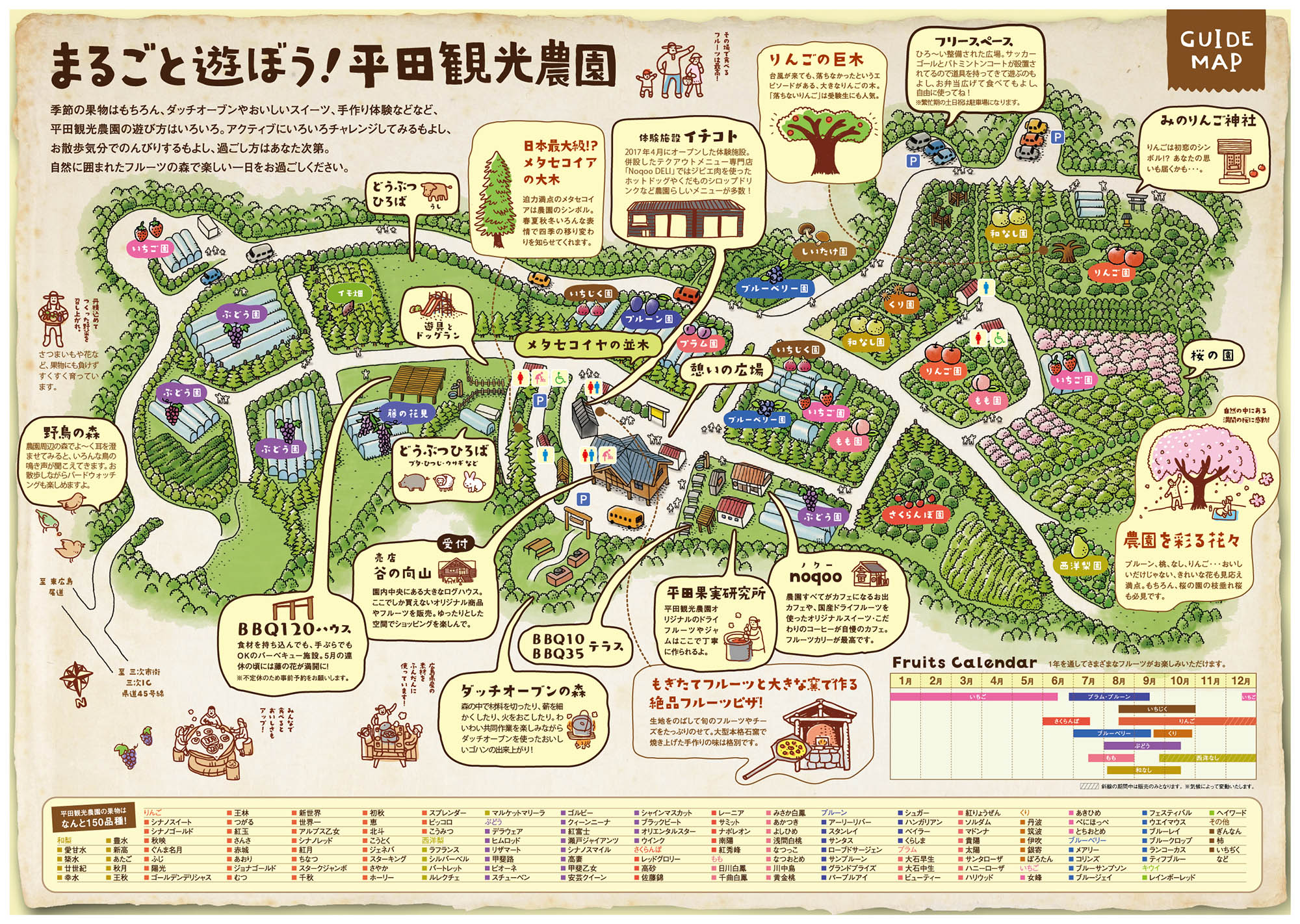 まず大人の方は16枚綴りのチケットを、お子様は11枚綴りのチケットを購入していただきます。農園の地図と「果物対応表」なるものをお渡ししてそれを見ながら自由に各畑を周っていただきます。その表には