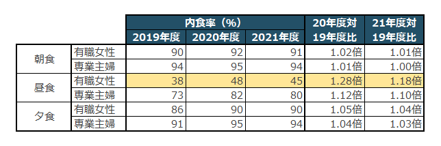 内食率は、昼食の有職女性で最も伸びています。在宅勤務の増加により、生活様式が大きく変化した影響と言えるでしょう。