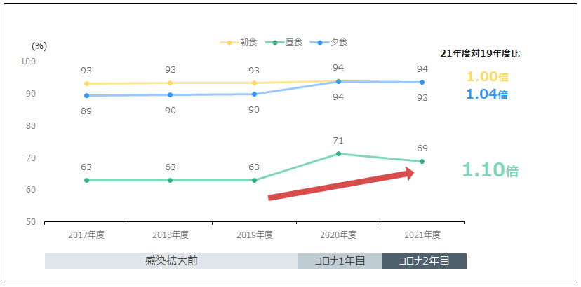 2017年度から2019年度にかけてほぼ横ばいで推移していた内食率が、コロナ1年目の2020年度に、昼食と夕食で増加しました。