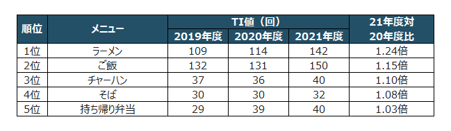 前年との比較で2021年度に最も伸びたのは「ラーメン」で、出現回数が1.24倍に増加。TI値でも、「ご飯」の150回に次ぐ142回と多くなっています。