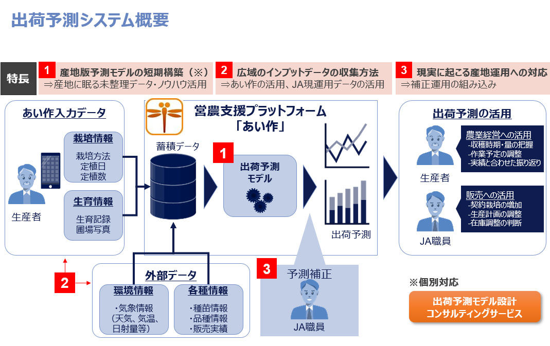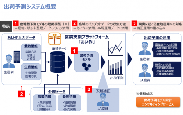 AIで算出された予測データを、最終的に営農・販売担当者がデータを確認しながら補正することで、より精度の高い出荷予測を実現するものです。