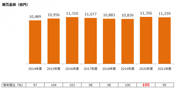 果物の市場規模は2014年度から2016年度にかけて増加したのち、2019年度にかけては緩やかな減少傾向にありました。ところが、コロナ1年目の2020年度には前年度比105%と再び増加に転じ、1兆1356億円となっています。コロナ2年目の2021年度には、前年度比99%と微減したものの、コロナ前の2019年度の水準を上回っていました。