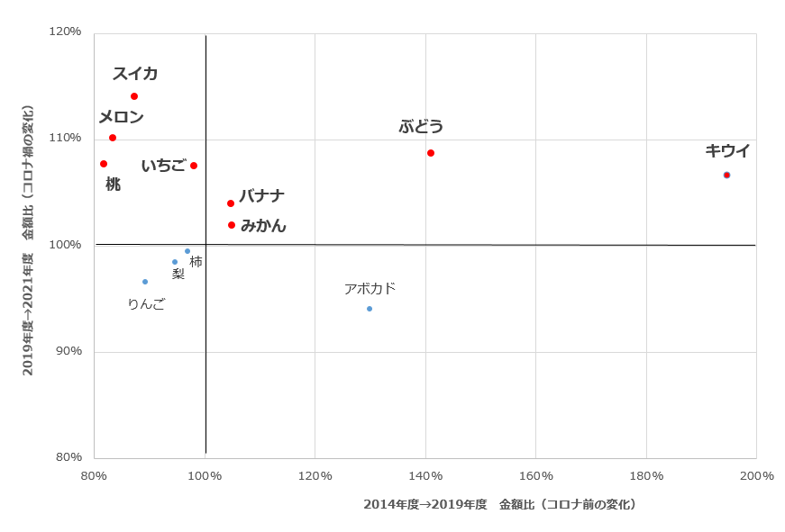 コロナ禍の変化では、スイカ、メロン、ぶどう、桃、いちご、キウイ、バナナ、みかんと多くの果物が伸長していました。コロナ禍のお取り寄せグルメなども含め「おうちでプチ贅沢」需要で、単価が高いメロンやぶどう、桃なども人気となっているのでしょうか。