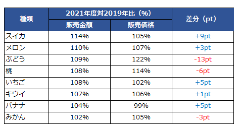 一方、スイカ、メロン、いちご、バナナについては、差分が+5ポイント以上と、販売数量が増加したと考えられます。