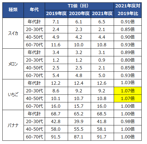 2021年対2019年度比でTI値の伸びが確認できたのは「いちご」で、年代計で1.03倍、20-30代と40-50代では1.07倍と年代計以上に伸びが見られました。いちごは洗うだけで食べられ、ヨーグルトやスムージーなど簡単にアレンジして食べることもできることから、幅広い世代で人気となったとうかがえます。