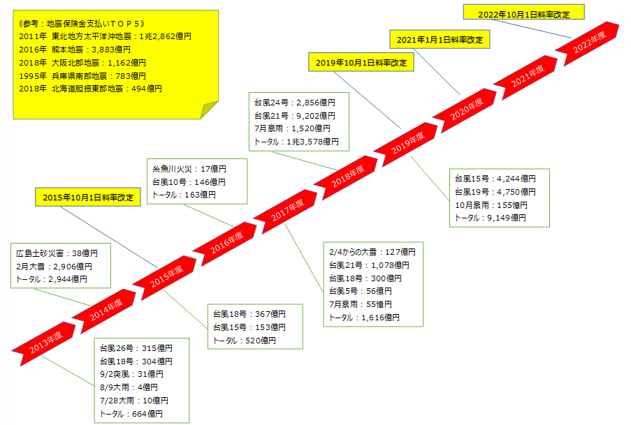 このような大規模な自然災害の発生は、損害保険会社が提供する火災保険の保険料に大きな影響を与えています。なぜなら、火災保険の保険料は、保険金支払実績を基に割り出されているからです。