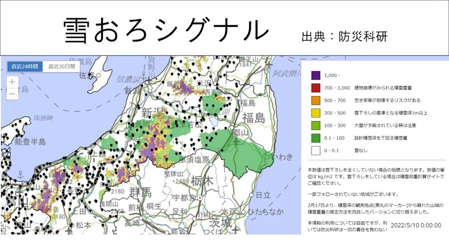 また、豪雪地帯で悩まされる「屋根に積もった雪下ろしの判断に役立つ情報」などもあります。これは防災科学技術研究所などが開発したツールで、その名も「雪おろシグナル」。積もった雪の重さがどれくらいかを分かりやすく、色分け表示しています。例えば黄色は雪下ろしの基準となる1mを表し、赤色は建物が倒壊するレベルを意味します。スマホからでも確認する事ができるので、雪下ろし作業の一つの目安としておすすめです。
