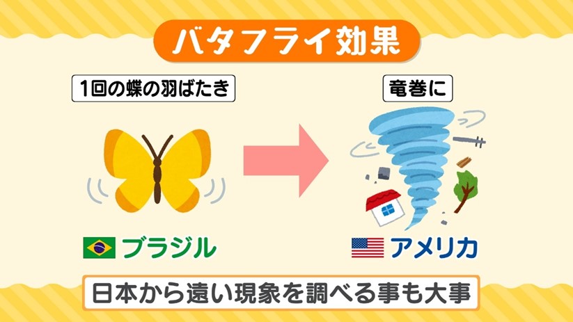 これは、「バタフライ効果」と呼ばれ、ほんの些細な出来事がやがて大きな影響を及ぼすかもしれないという事を例えています。「ラニーニャ現象」は、遠い南米の海の温度の変化の事ですが、それが大気にも影響を与えて、実は日本の冬の寒さや雪の量に関係してきます。