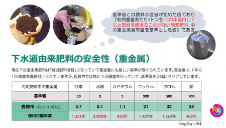 現在、下水汚泥肥料は普通肥料登録となっており、重金属にも厳しい基準が設けられています。佐賀市では年4回の試験を行い、基準値を大幅にクリアしています。