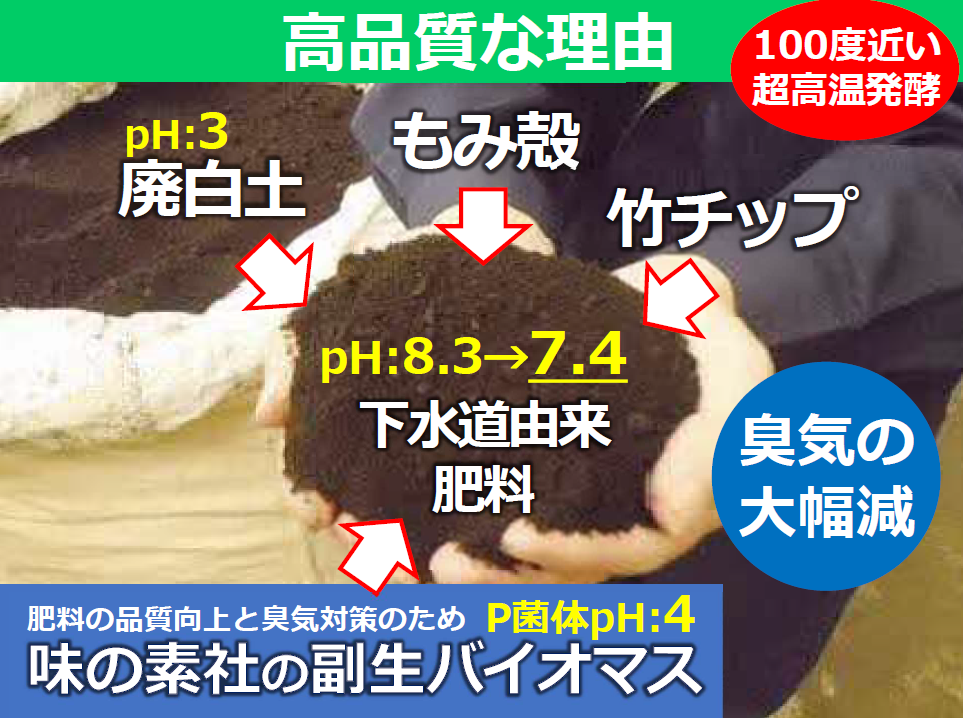 佐賀市で汚泥肥料の取組を開始した当初は、臭気の問題でクレームを受けたことがあります。クレームを受けて、臭気の無い肥料づくりに着手。その結果、味の素と組み、副生バイオマスを肥料に使う発想に辿り着きました。また、廃白土やもみ殻、竹チップなども混ぜて臭気を抑えつつ、品質を高めることに成功しました。