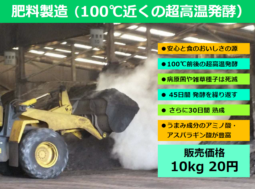 また、肥料は 10kg で 20 円で、購入者が自ら袋詰めするシステムとしました。この方法で年間 1400 トンが完売する人気の肥料となりました。